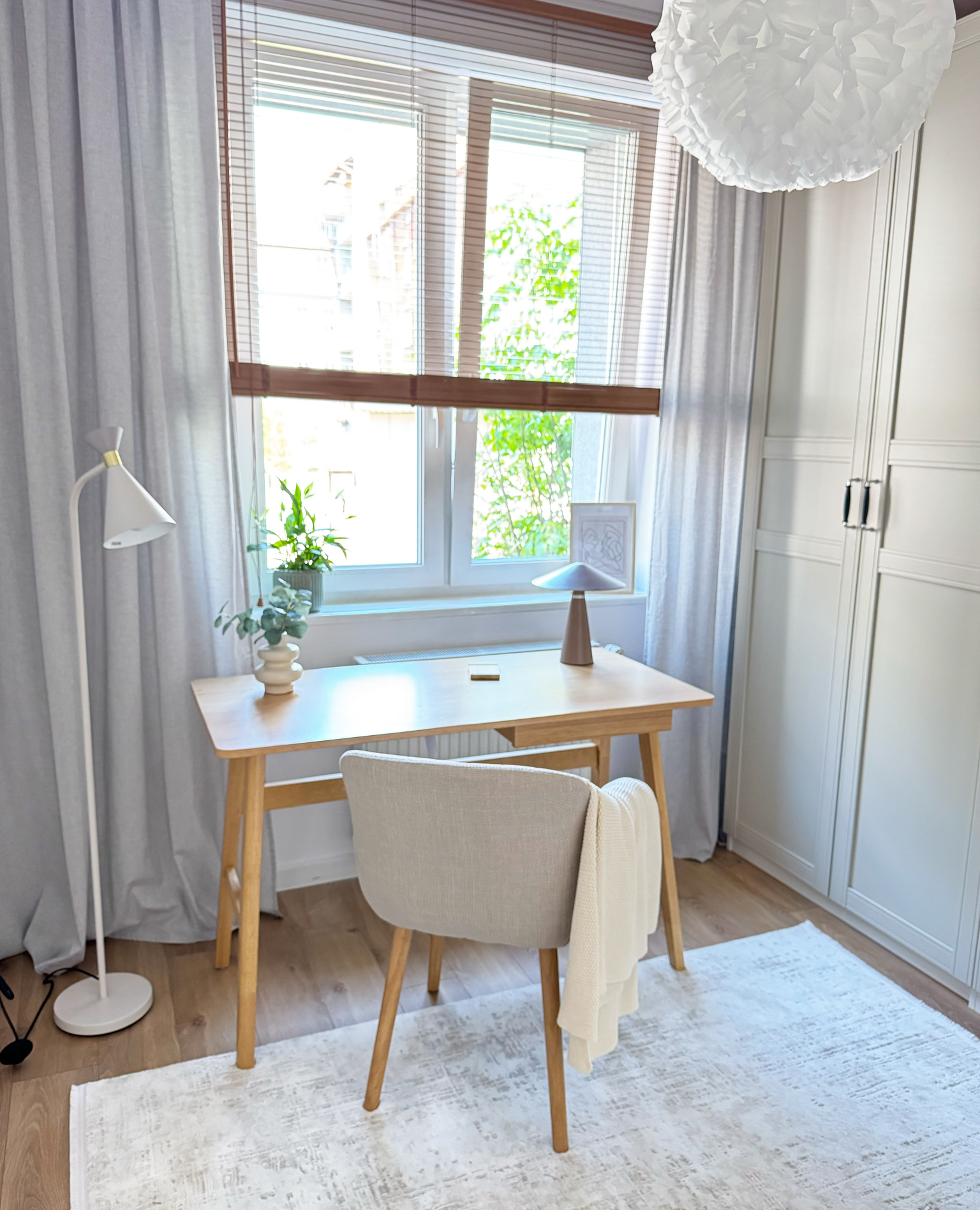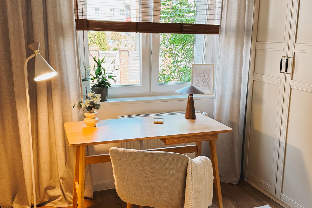 Dominująca paleta bieli i beżu sprawia, że wnętrze jest jasne, lekkie i sprzyja koncentracji. Neutralne barwy budują wrażenie uporządkowania, dzięki czemu przestrzeń działa kojąco i sprzyja efektywnej pracy. To pomieszczenie to idealne połączenie praktyczności i estetyki — uporządkowane, funkcjonalne i przyjemne w codziennym użytkowaniu.